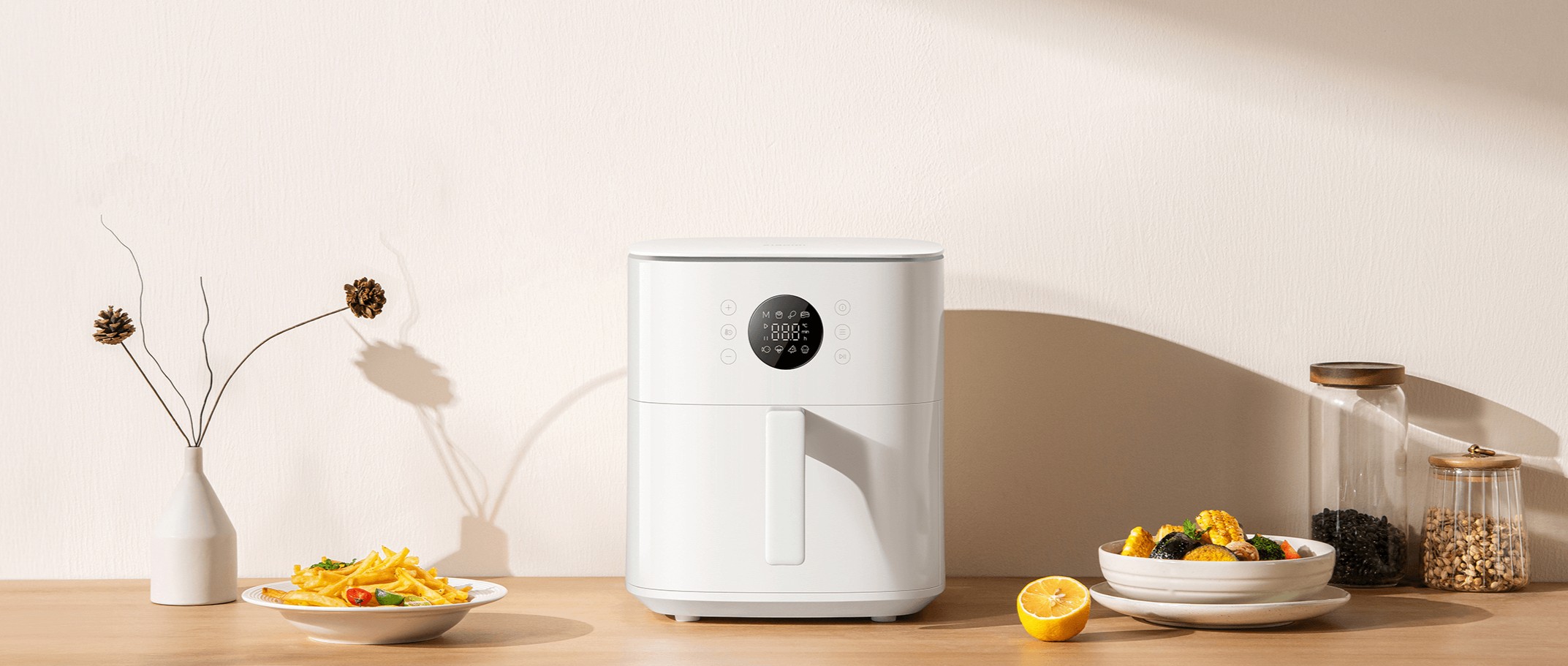 Xiaomi Smart Air Fryer BHR083NEU выполнена в современном и лаконичном корпусе, который легко вписывается в интерьер кухни. При габаритах 39 × 29 × 32 см аэрофритюрница остаётся достаточно компактной для своего класса, а вес 4,3 кг обеспечивает устойчивость на рабочей поверхности. Сенсорная панель и встроенный дисплей делают управление наглядным и аккуратным.