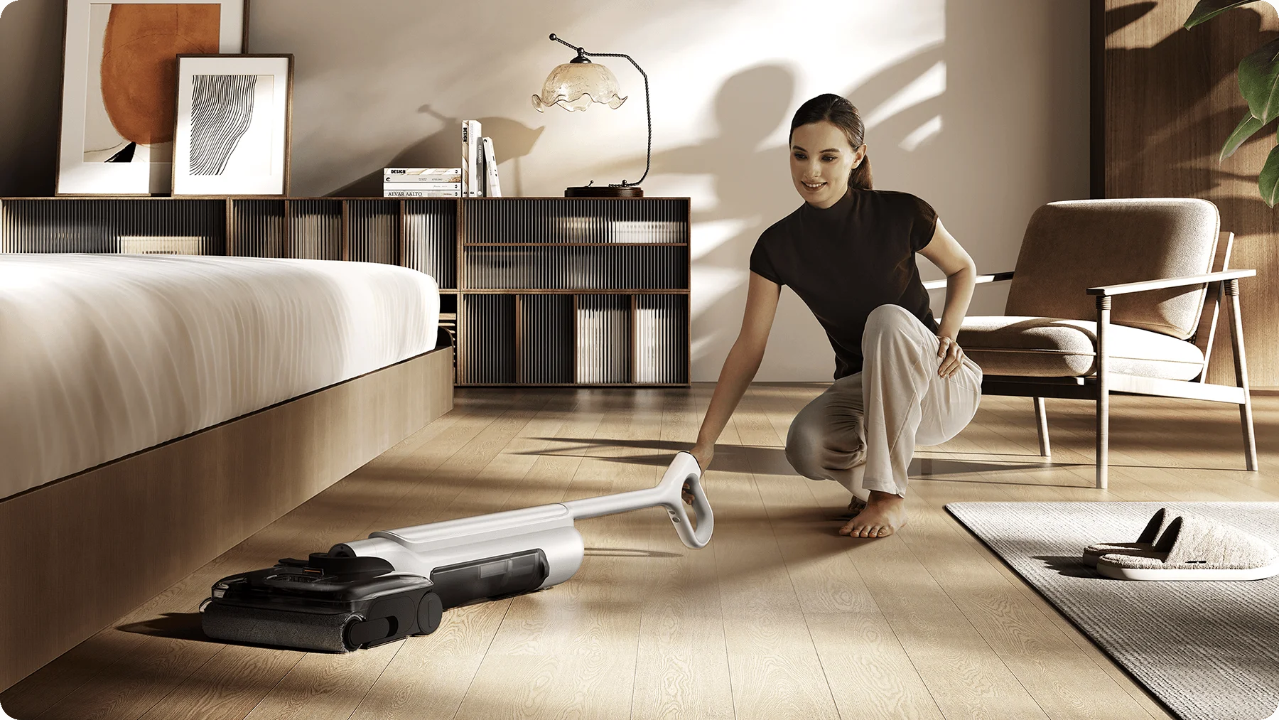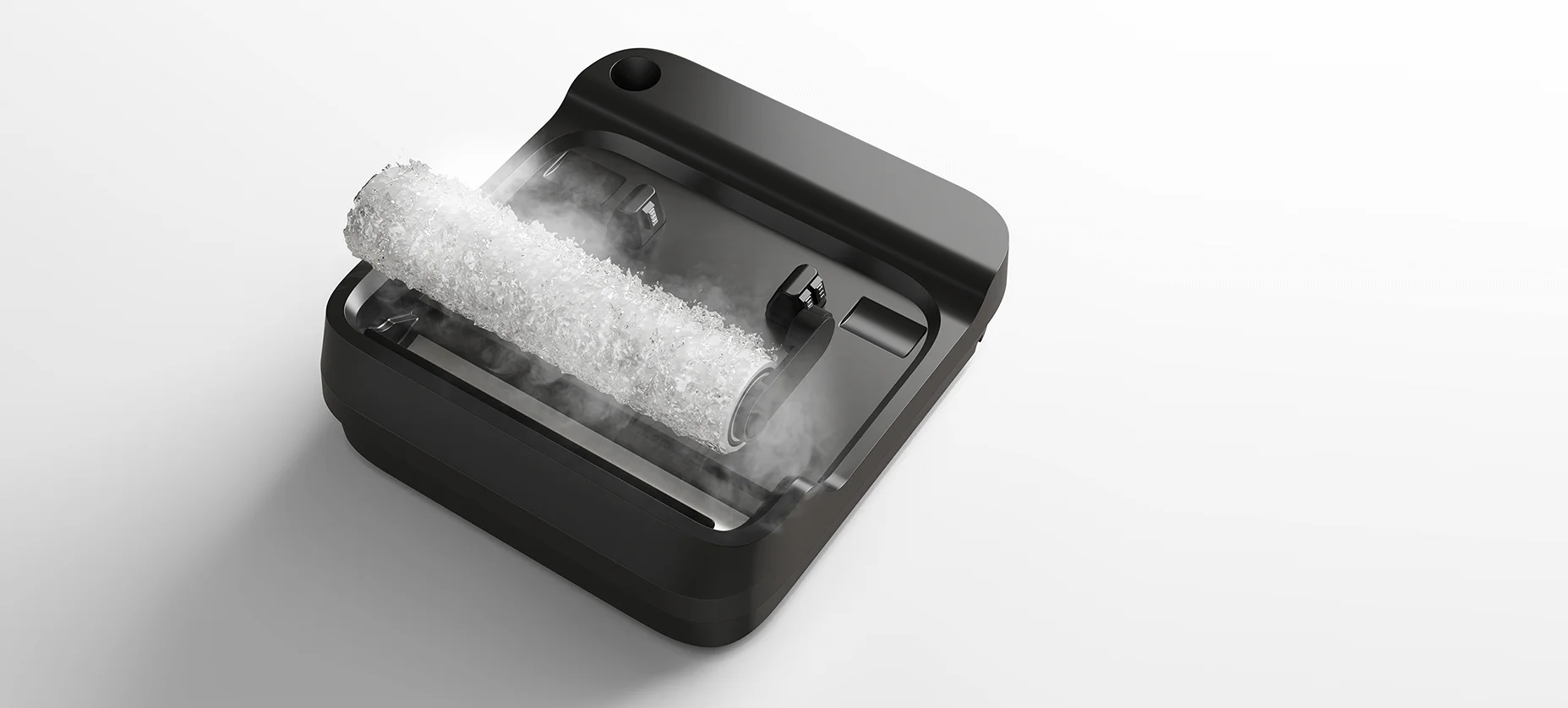 После завершения уборки роликовая щётка автоматически промывается и сушится горячим воздухом при температуре до 80–100 °C. Очистка и сушка выполняются встроенными средствами пылесоса, без отдельной станции самообслуживания. Это помогает предотвратить появление запахов, развитие бактерий и продлевает срок службы ролика.
